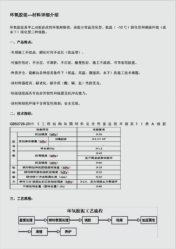 五、使用说明:环氧胶泥·清理基材表面:对粘接面进行打磨去除表面浮浆及松散层,露出新面并用空压机吹除粉尘,然后用丙酮除去污物。·钢板表面除锈:可用喷砂、砂布或钢丝刷等进行打磨抛光,直到出现金属光泽为止。·按甲∶乙=比例称取所需用量,进行充分混合,涂于钢板被粘接物表面上,厚度为 1-3mm,并使胶层中间厚边缘薄。·钢板粘贴到位后,应立即用化学锚栓或膨胀螺栓进行固定并适当加压。·在胶固化前请勿移动粘接件,以免影响粘接效果.