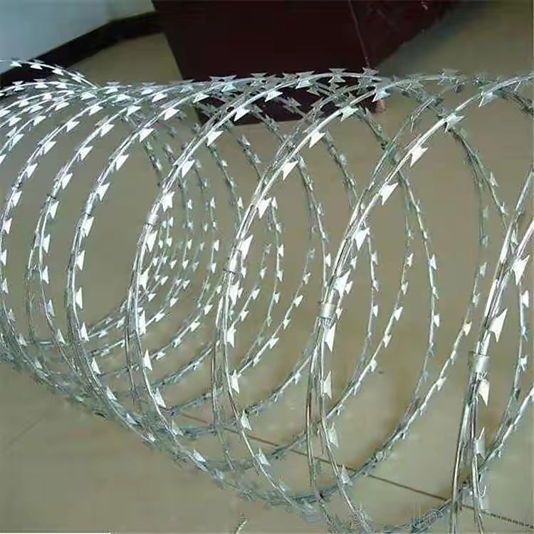 热镀锌刀片刺绳制作材料:刀片刺绳带采用0.5±0.05mm热镀高锌Q195钢板,成卷纵剪,用专用刺绳冲切机器一次冲裁成多条标准刀刺型号的板条,宽度22mm,刀刃垂直剖间距15mm,刀刺纵向间距34mm,并缠绕成卷,以备后用。刀片刺绳芯丝为ø2.5±0.1mm热镀高锌冷拔钢丝,相比普通铁丝,钢丝材料质地更硬,抗拉强度更高,钢丝刺绳外形更挺直。刀片刺笼纵向拉筋采用两股同芯丝的高强钢丝螺旋缠绕,相距120mm采用ø2.2mm钢丝反拧成刺丝,紧密捆扎在股丝上。